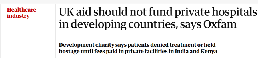 We published two papers last week, written by my brilliant colleagues Anna and Anjela with the help of many others. They are the result of years of painstaking investigations in multiple countries into the appalling treatment of patients in private hospitals. We uncovered many stories like Micah’s one, and of patients themselves being imprisoned in hospital until bills are paid, including a child of 11 kept for months. In one example, a child badly hurt and left unconscious by a traffic accident was denied treatment by a CARE hospital in Delhi unless the family paid US$1,200.