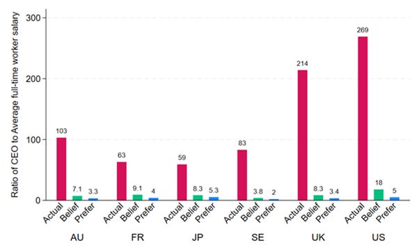 Here is a mind-blowing graph from the study showing the gap between what people believe and the actual ratio of CEO to worker wages.