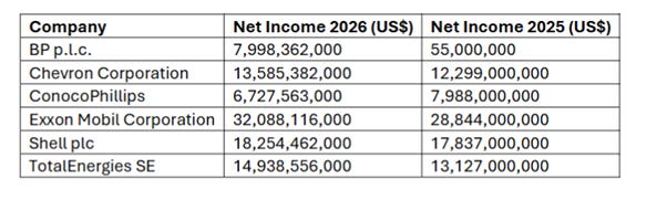 Six oil giants are on track to earn nearly $3,000 every second in 2026. Using consensus estimates, which is the average of the forecasts that financial analysis make, the Big 6 oil companies are on track to make a combined $94 billion, which is enough to provide solar power for the energy needs of almost 50 million people in Africa.