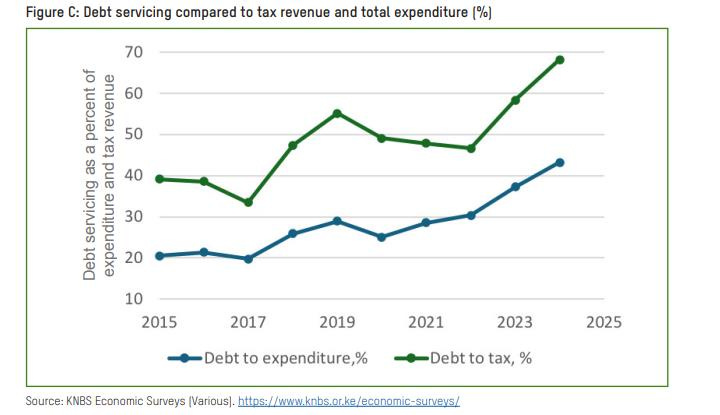 Debt repayments over social spending. In 2024, out of every 100 shillings collected in taxes, 68 shillings were used to repay debt. This is double the amount in 2017. Debt repayment is twice the education budget and nearly 15 times the national health budget.