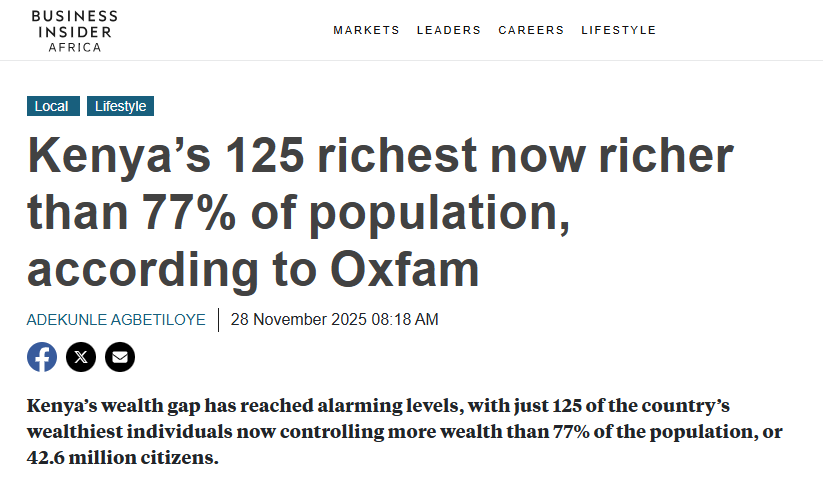 Powerful work documenting how 5% annual growth can coexist with a 37% rise in extrme poverty. That 68 shillings out of every 100 going to debt repayment really crystalizes the structural bind Kenya's in, where IMF conditionality essentially locks the country into a regresive tax system that bleeds the poor. The data on women holding just 13% of agricultural land rights, dropping to 4% among the poorest households, shows how inequality compounds across multiple dimensions simultaneuosly. Would be curious if Oxfam has modeled what a wealth tax on the richest 125 Kenyans could fund in terms of basic services versus the current VAT-heavy approach.