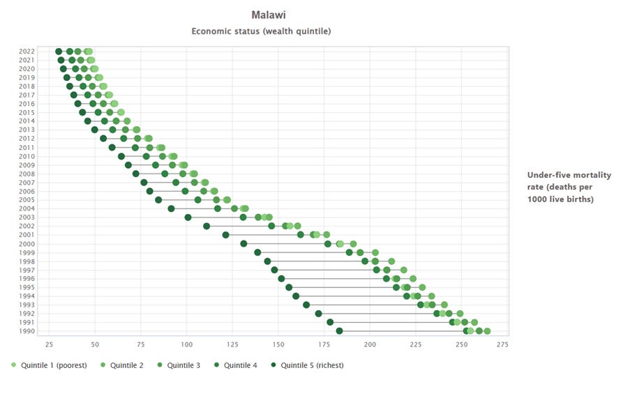 As of 2022 that figure is now 47, so instead of one in five, the figure is now one in 20 babies born into a poor family in Malawi is likely to die by the age of five. That is still an appallingly high number. In the UK it is 4.7 in the poorest areas of the UK. That is one chance in 212. But it is also an enormous improvement in a little over twenty years. An improvement that is all the more impressive because there were 11 million Malawians in 2000 and today there are 22 million. That is a lot of births.