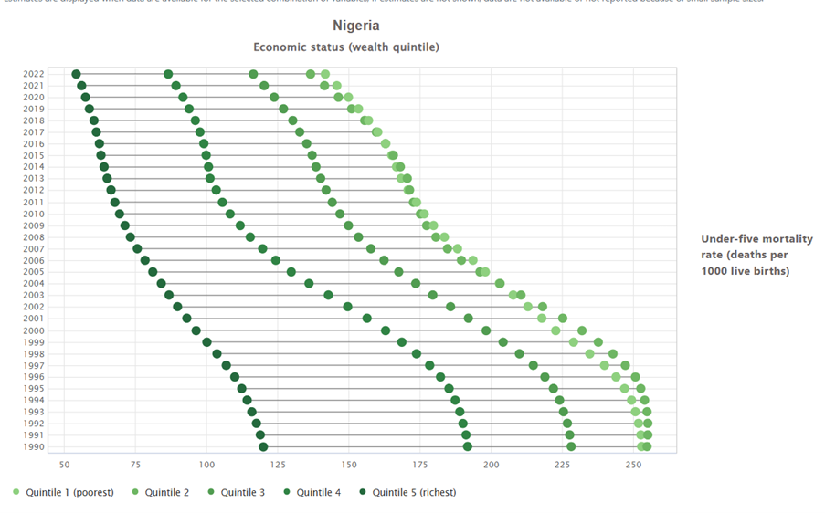 Take Nigeria for example. Again since 2000 a big improvement- average under five mortality has reduced by a little over a third since 2000, from an average of 180 per thousand live births, to 110 in 2022. Yet you can see that there has been minimal decrease in health inequalities; a child in a poor family is twice as likely to die before they are five years old than a child in a richer family.