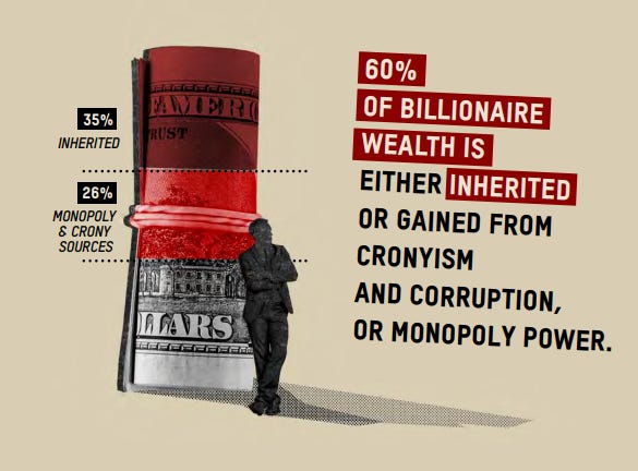 They don’t deserve it in the first place. Billionaires like to portray themselves as the pulling themselves up by the bootstraps sort. Work hard and you too could have your very own rocket ship. According to Oxfam’s research, 60% of billionaire wealth is unearned, either from inheritance, cronyism or monopoly sources. In 2023, more billionaires were created through inheritance than through entrepreneurialism. What’s more, the fortunes of many modern-day family dynasties were built on colonialism, slavery and even through close collaboration with the Nazi party (listen to our episode with David de Jong on this). Today, a rigged financial system means the richest 1% in Global North extracts $30 million an hour from the Global South.