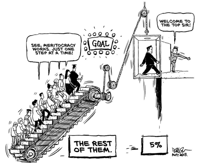 What if meritocracy is simply another form of class oppression, and in some ways an even more dangerous one? Basically, just because you are clever why should you have more money, more wealth, and a better life, any more than someone who has inherited a fortune from their parents? Why is that any morally better?