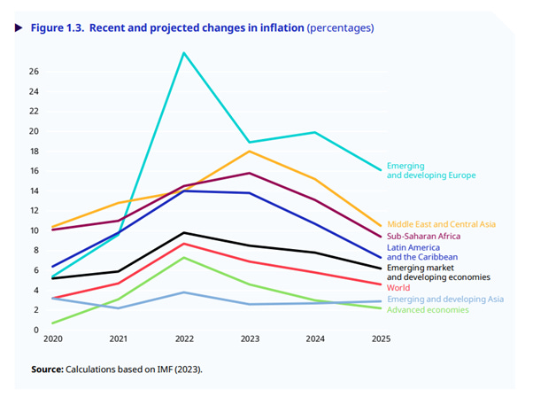 The economic picture. Inflation has been soaring, with emerging and developing economies suffering the worst of it. Inflation is now easing, but likely to persist over 2024 and 2025, and will continue to significantly affect real wages. Interest rates increased at rates not seen since the 1980s with significant global repercussions to trade and investment. Global GDP growth severely slowed and was projected to grow by just 0.3% points in 2023.