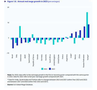 Falling real wage growth. According to Oxfam’s calculations, workers across 52 countries have lost a combined $1.5 trillion (£1.2 trillion) over the last two years, equivalent to nearly a month (25 days) of lost wages for each worker. The ILO research concurs, despite lower unemployment finding that real wages declined in the majority of G20 countries in 2023.