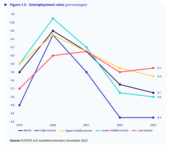 Labour market conditions. Global unemployment was 5.1% in 2023, a 0.2 percentage point decline – a small improvement. In high-income countries, unemployment stayed about the same and declined in middle-income countries. Low-income countries saw a worrying increase.